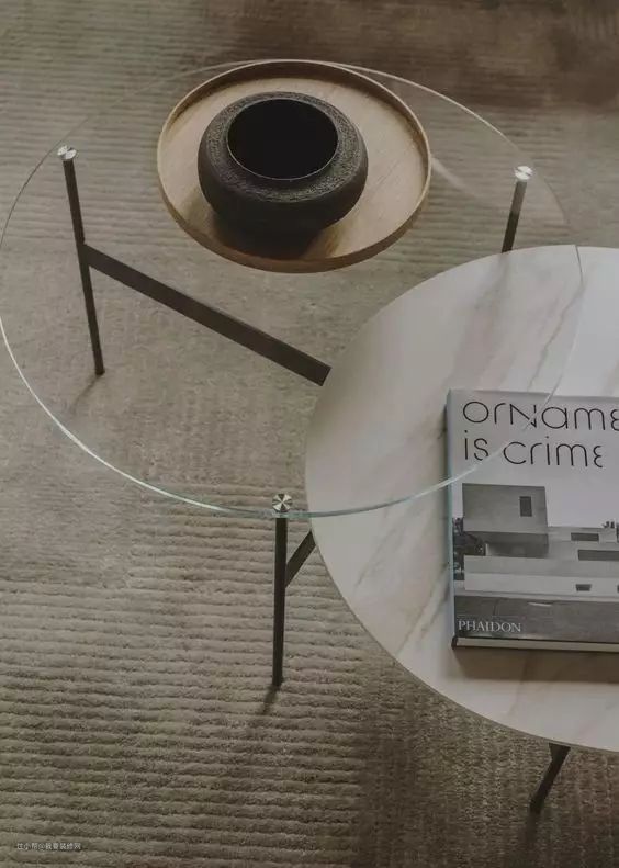 例如地面铺贴瓷砖,茶几就尽量避免大理石和一些抛光类材质,例如玻璃、抛光金属。而选择木材类、亚光金属等。