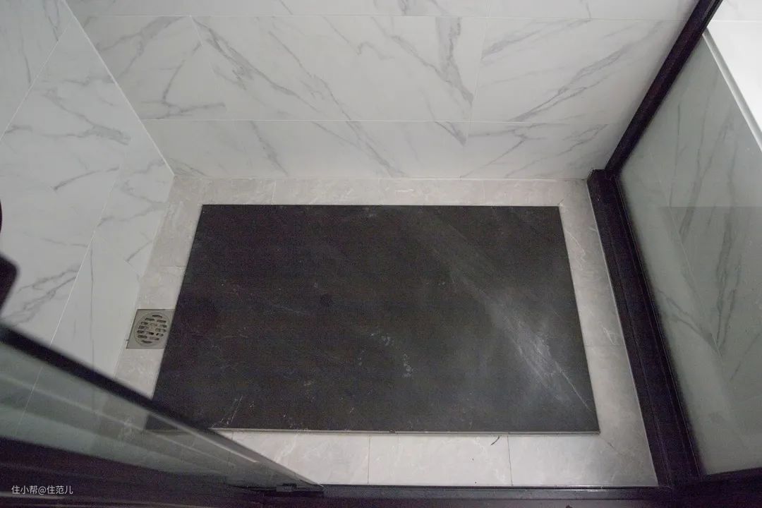 住范儿客户珊珊家,淋浴区做了回字型下水,中间的黑色石材比周围高出一个手指的高度,中间凸起,四周凹陷,脚下不容易积水。