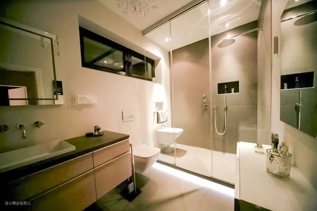 ● 一些酒店会用茶色玻璃做淋浴房,对氛围营造更好,脏了也不太能看出来。