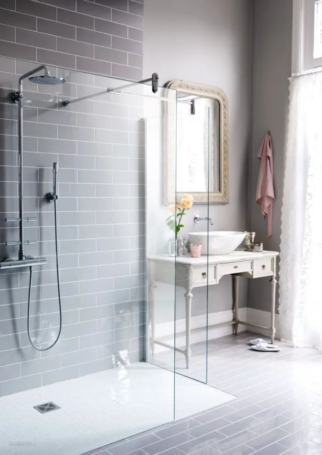 淋浴区是长方形,一定要把花洒安在短边的墙上,这样背对着花洒洗澡的时候,前面的空间更多,视野看见的区域更加宽敞。
