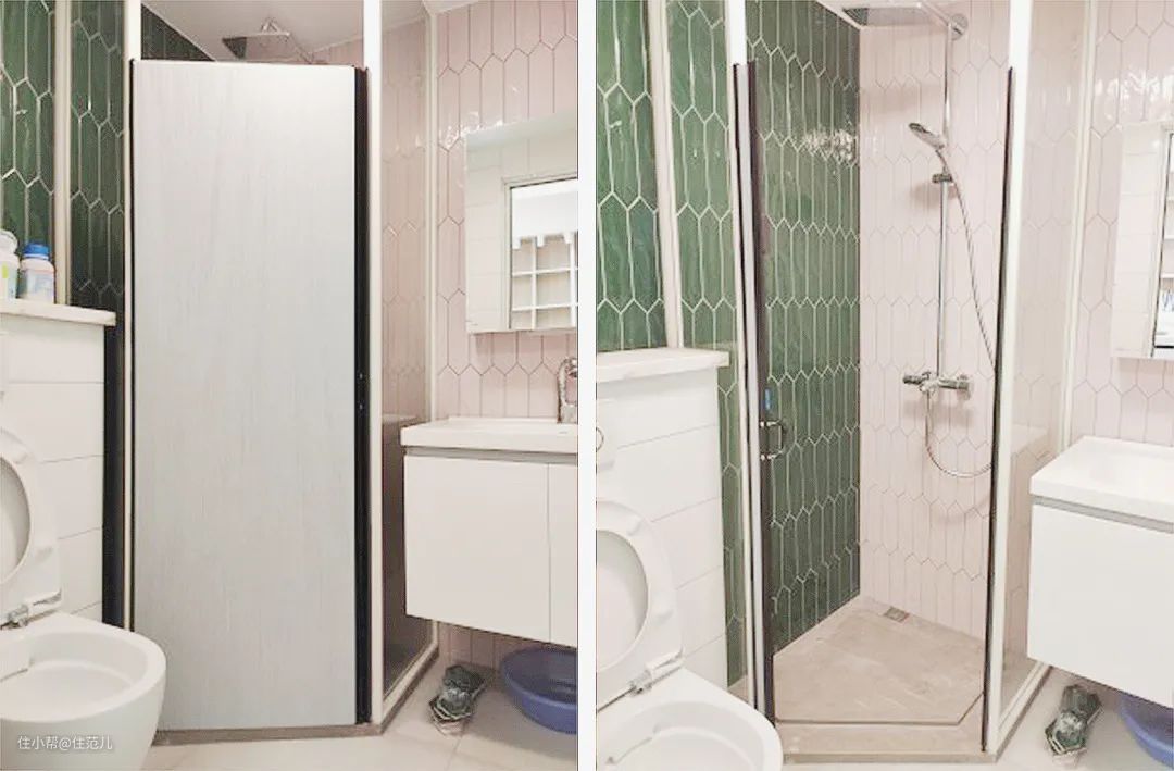 还有一种北欧常见的折叠淋浴间,两扇圆弧玻璃门,不使用时可以内推靠墙,实现隔断180°自由旋转开启,超级节省空间。