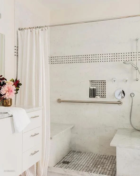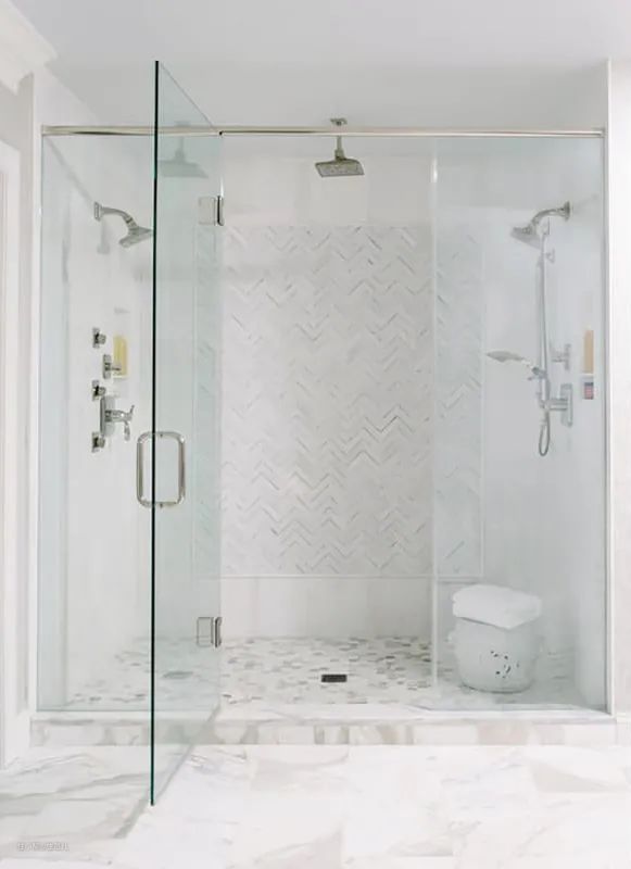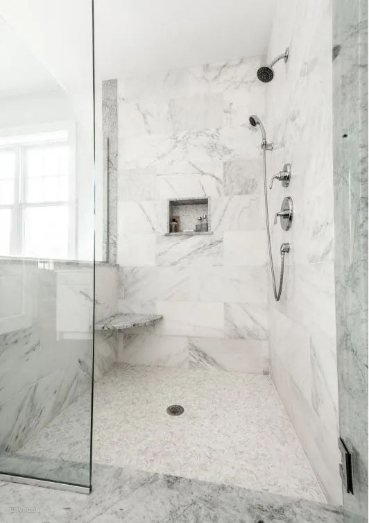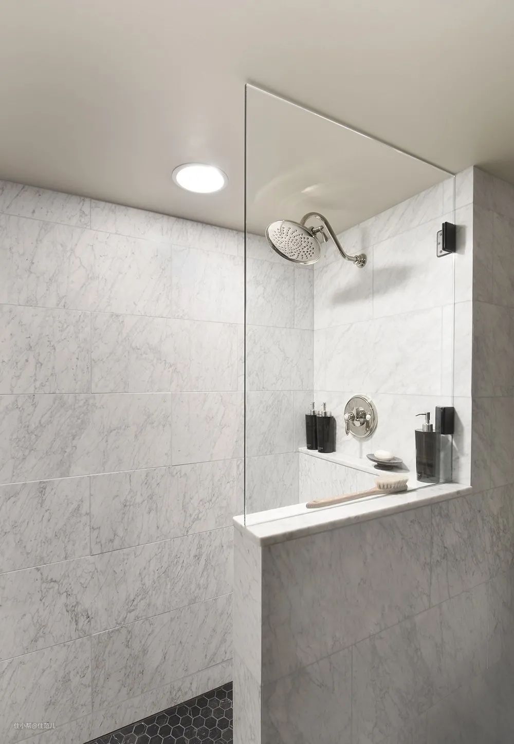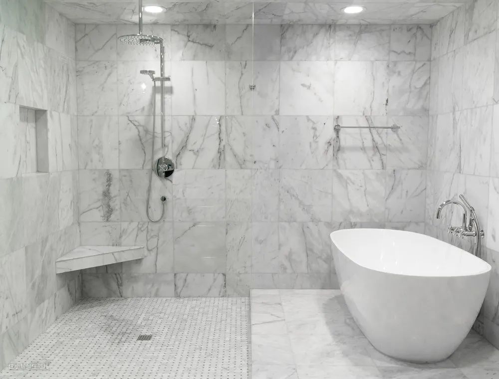 淋浴区是长方形,一定要把花洒安在短边的墙上,这样背对着花洒洗澡的时候,前面的空间更多,视野看见的区域更加宽敞。