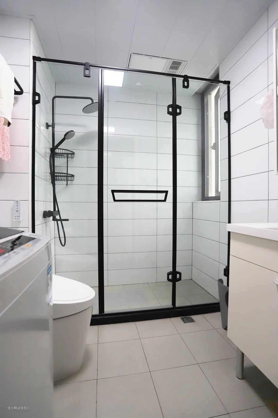 住范儿客户Alice家的淋浴房原来是标准的转角型,另一边砌了一堵砖墙,改成一字型的淋浴房,分区更明确,相比于玻璃墙,砖墙既省钱又方便清洁。