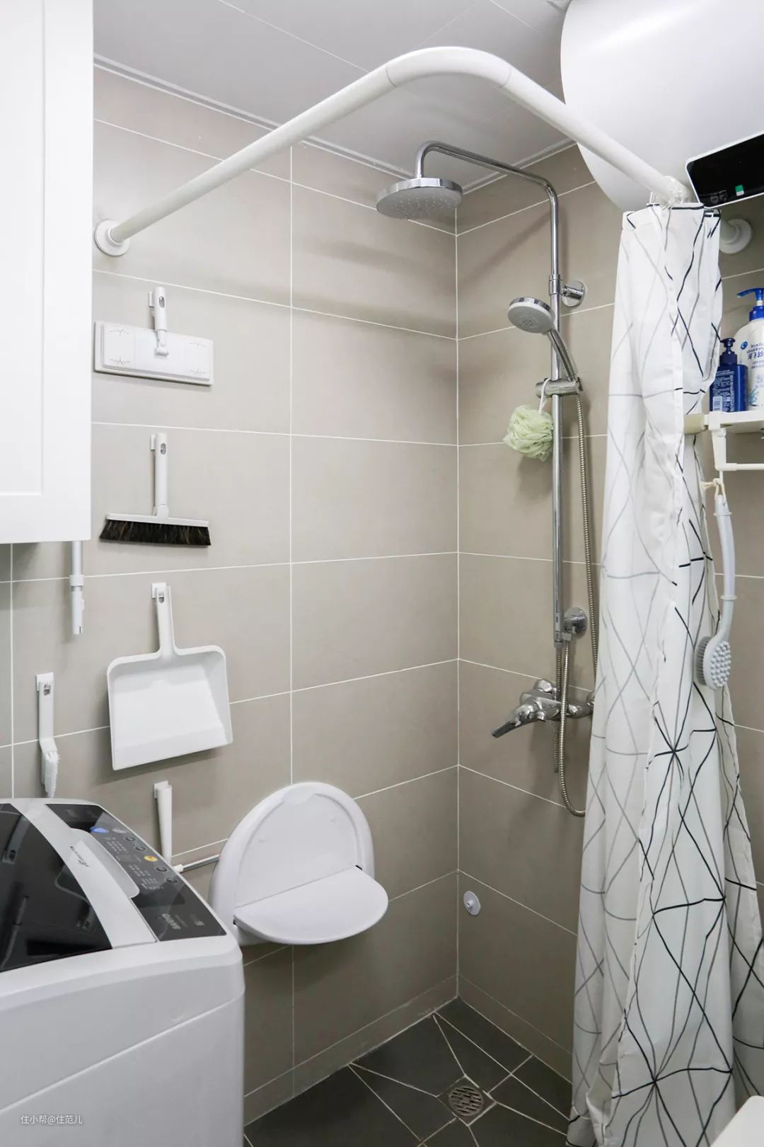 还可以换个思路,用浴帘挡住浴室柜和马桶,而不是把自己围起来,地面可能会被溅湿,但浴室柜和马桶都能保证干燥。