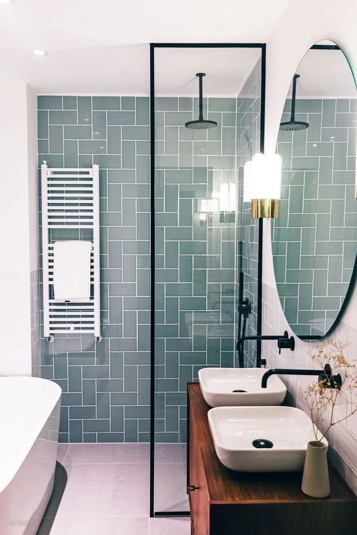 国外浴室美图里常见的玻璃隔断,在淋浴区空间大的时候反而更好用,比浴帘干净利落,又没有淋浴房看着那么挤。