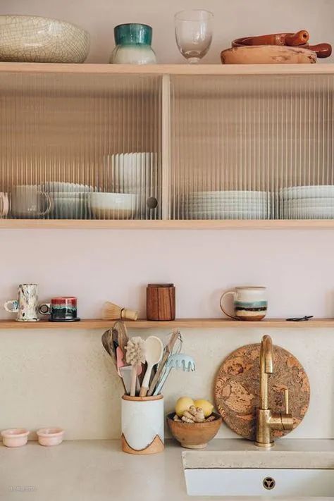 长虹玻璃做橱柜,隔绝油烟的同时又能隐约的看到五彩各式的餐具,既减少了色彩杂乱感,又保有一定的展示作用。
