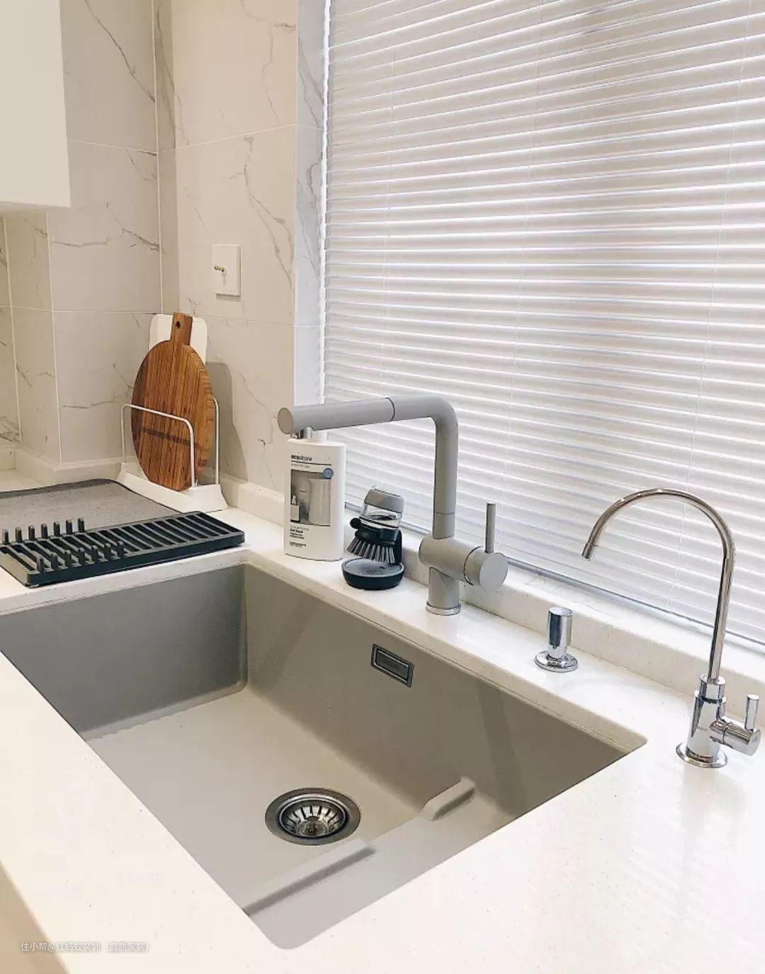 厨房面积比较小的,选择单槽,结合沥水篮一起使用。如果厨房面积大点,习惯把食材放入水槽清洗,选择能洗锅的双槽,再配上抽拉水龙头,下厨效率更高。