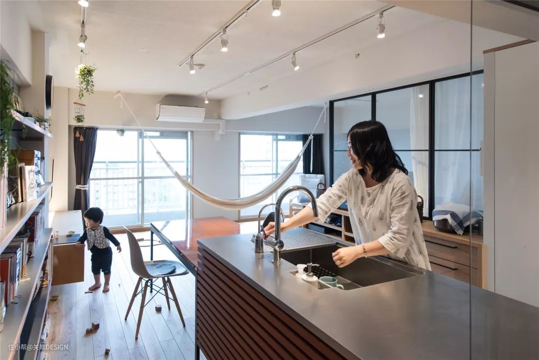 而客厅就只是大人喝茶、小孩玩耍的地方。一旁洗碗的妈妈也方便随时随地看到孩子。