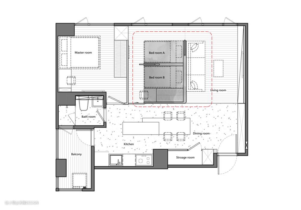 利用地面高度差和不同材质,形成明晰室内外空间分区。它是可以利用建筑结构「额外」拓展出来的空间。却巧妙的隐藏了家里的杂乱。