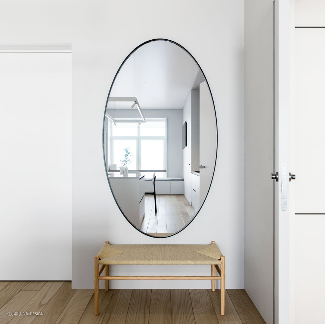 一面大型的椭圆形穿衣镜让小空间得到放大,搭配木质换鞋凳,简约而实用。