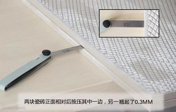 在挑选瓷砖时,随机挑选几块,用目光沿瓷砖的边线和对角线分别打量,如果发现有“翘边”现象,就说明瓷砖的平直度不够,如果没有,就说明瓷砖的平直度基本过关,也可以将两块同型号的瓷砖正面相对,然后用普通157g铜版纸对折后插入缝隙,如果能轻松进入则说明瓷砖的平整度存在缺陷。