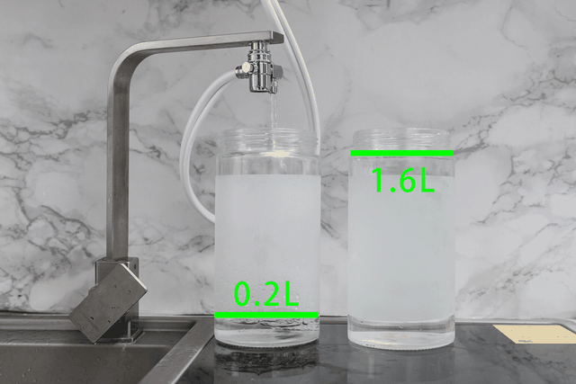 ▼实际测,1分钟可以接1.8L左右的水,当然这个和水压有一定的关系,我这里的水压在0.35左右,出水流量在700G左右。