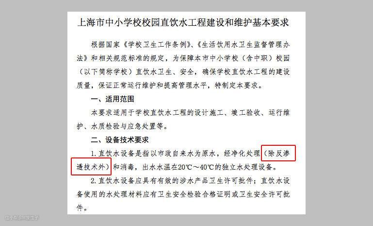 ▼首先我查询了文章中提到的上海的相关规定,首先文件的准确名称是【上海市中小学校园直饮水工厂建设和维护的基本要求】,是2013年的沪教委的一份文件。文章中确实有提到,上海中小学直饮水净水处理排出了反渗透技术,但是并未说明原因。