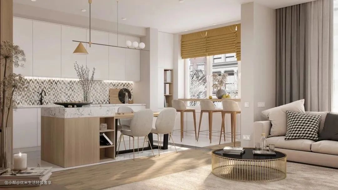 只需要将对外一侧的橱柜边沿加高20公分左右,就能遮挡住厨房台面那些瓶瓶罐罐,同时还多了一些收纳空间。
