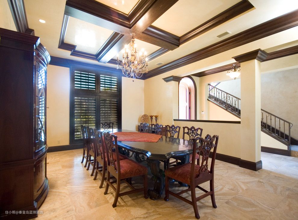 美式风格的吊顶处理手法也是比较风格,因为美式衍生的混搭较多,具体吊顶方式就是要根据具体混搭来搭配了。