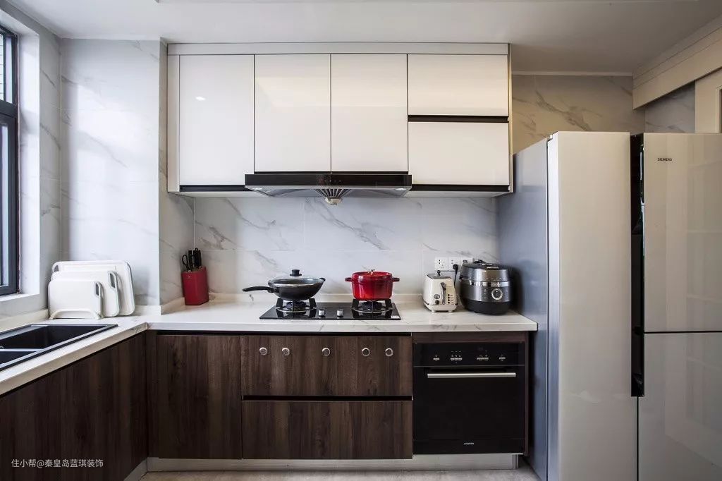 把冰箱“安装”到橱柜里面去,这就要求定做橱柜的时候,提前为冰箱预留出尺寸,看到下图了吗?冰箱显得会有点唐突,但好在橱柜有点连贯性,也可以解决一部分收纳问题。如下面几个案例:
