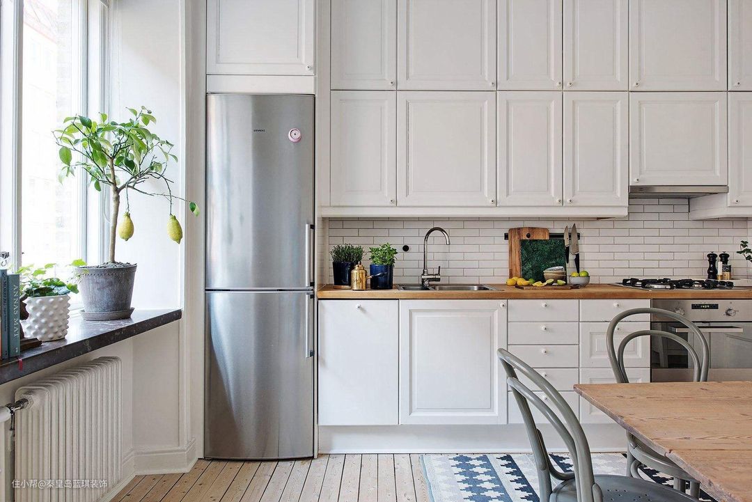 就是直接把冰箱放在厨房的某个预留区域,就像下图一样,这种情况冰箱基本是独立占据一个区域,与橱柜没有什么关系,处于“裸奔”状态。