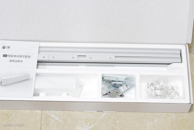 小益C3智能电动窗帘包含了电动窗帘主机、轨道、皮带、卡扣、滑车、挂钩等配件,除此之外还有一个遥控器和一本说明书。