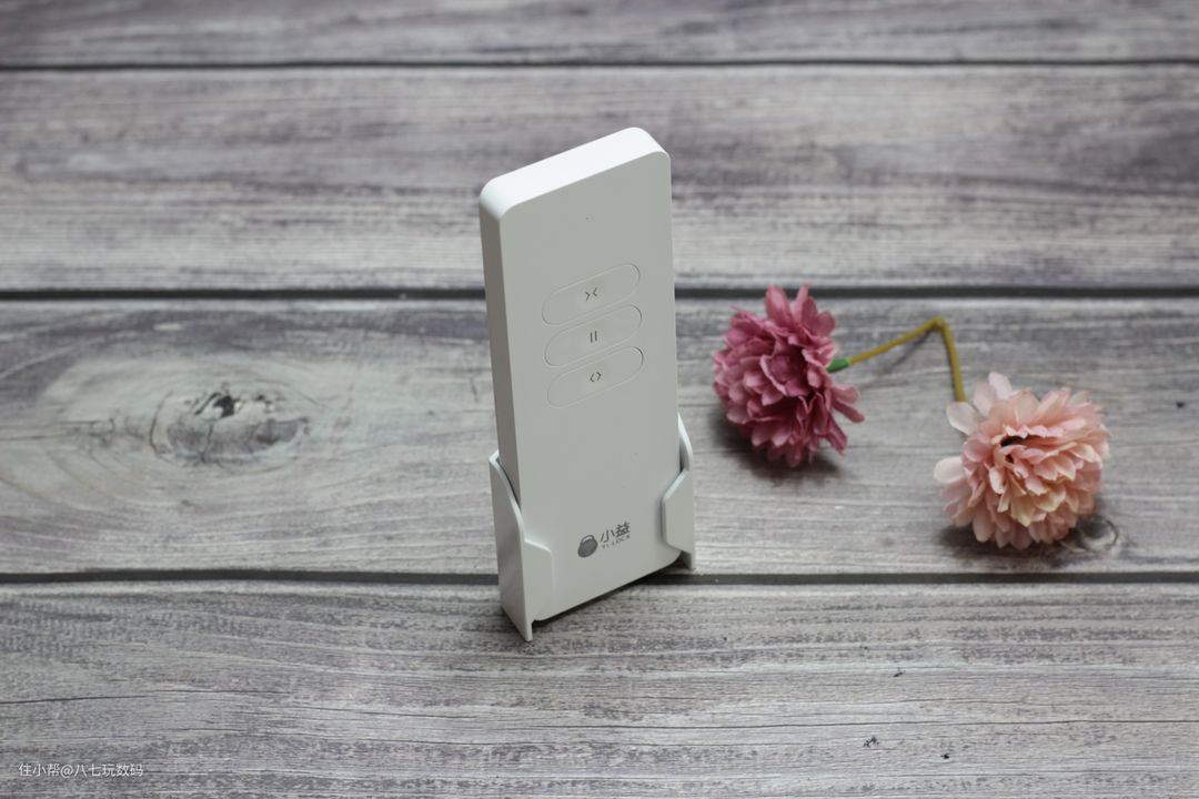 小益C3智能电动窗帘遥控器一共有三个按键,分别是关闭、暂停和开启,上面的图标标识也很清晰明了,还带了一个安装在墙上的固定挂架,收纳起来也很方便。