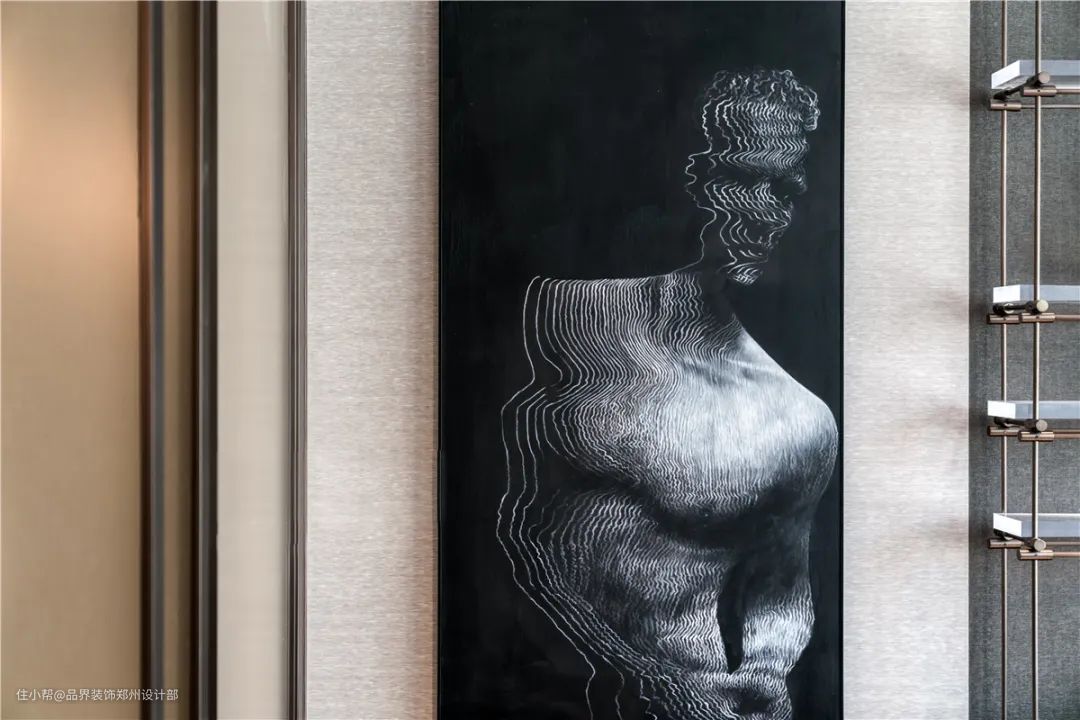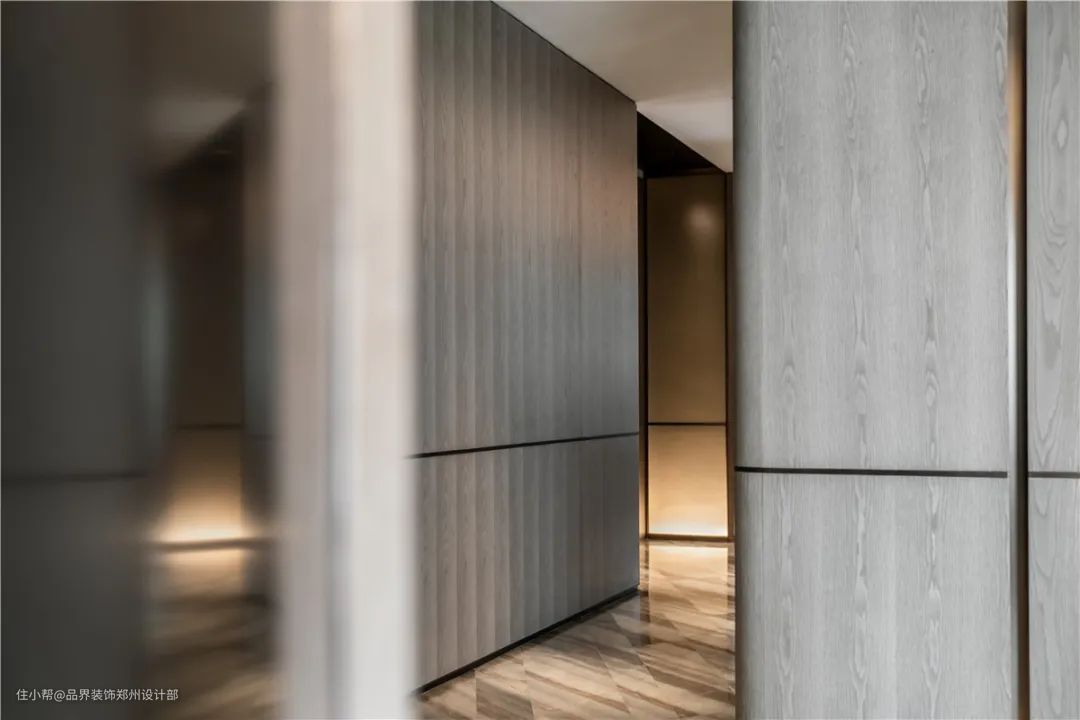 入户玄关作为住宅的第一印象,“一步一景”的布局方式,在古铜色基调背景下,内外转承营造了强大的气场。同时为了提升空间的通透性,设置了对称的屏风入户门,加上灯带向上洗的照明方式,更是整体加强了神秘感的入户体验。