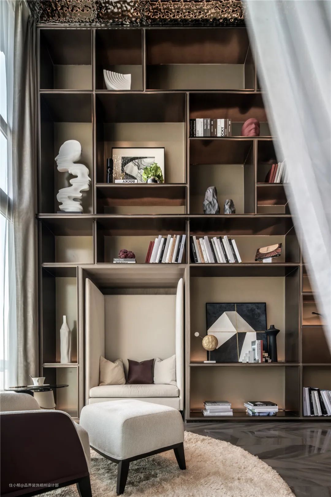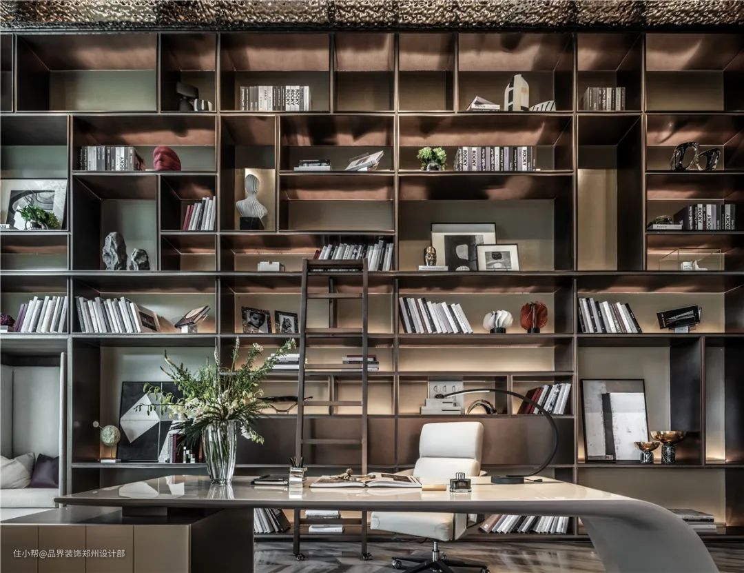 客厅的主景墙就像独立的闪光点存在于整体空间,米白主调的现代家具,通透而明快。区别于客厅,阅读区的设计手法更具装饰性,一摞书柜把空间做得更加饱满。大小体块的分割与客厅的明快利落,形成强烈的对比。