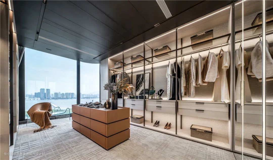 偌大的衣帽间,步入式衣帽柜体长廊,中岛式首饰台均为顶级豪宅必备属性。此空间以序列性强调奢华,意在呈现极致的空间体验,把大平层豪宅的体验发挥到极致。