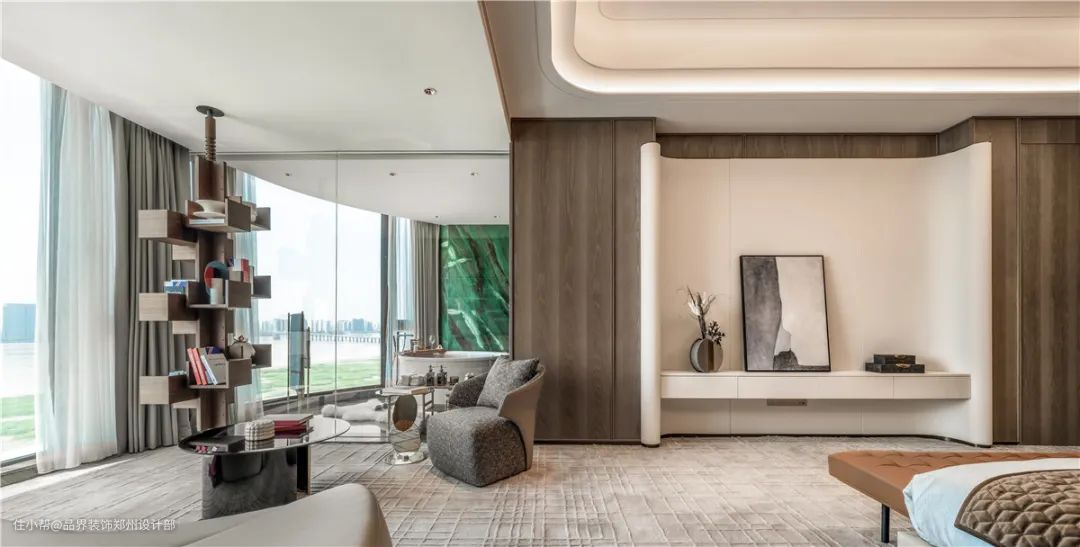 主卧被打通后,增加了一个36平米的衣帽间。睡眠区和休闲区,合理布局,一分为二。在休闲区,男女主人可享受到绝美的一线江景,众揽四季变幻。皮革硬包的床背幅,酒店式客房地面的进口羊毛地毯,舒适、大气又整体。而悦人的灰橘色的加入,呈现了空间的奢华与时尚。