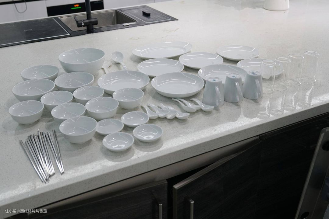 为了看得更加直观,在拍完上面那张照片后,我们又找了一块开阔的台面,折腾着把上图碗篮中的所有碗碟、水杯以及筷子、勺子等物品一并取出,摆了满满一桌子 ▲