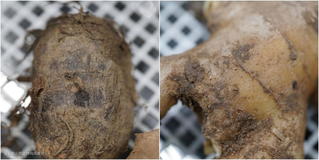 生姜的洗净效果一目了然,但是芋头表面都是粗纤维绒毛,根本无法目测是否洗净 ▲