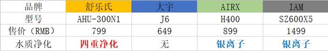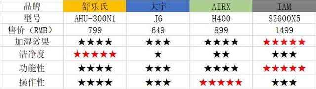 加湿档位上,IAM分五档,AIRX为三档,舒乐氏和大宇为两档。