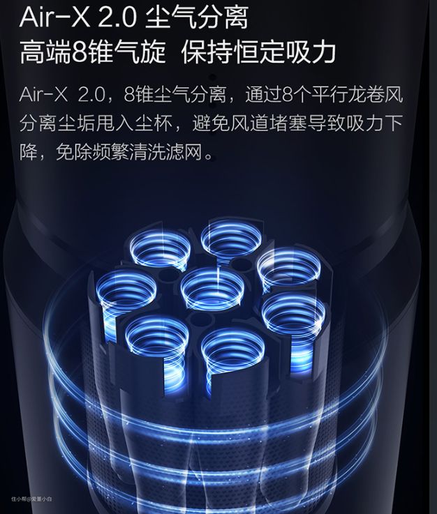 ▲▲第二重过滤,8锥气旋分离技术,更好的实现尘气分离,避免风道堵塞,提高过滤效果。
