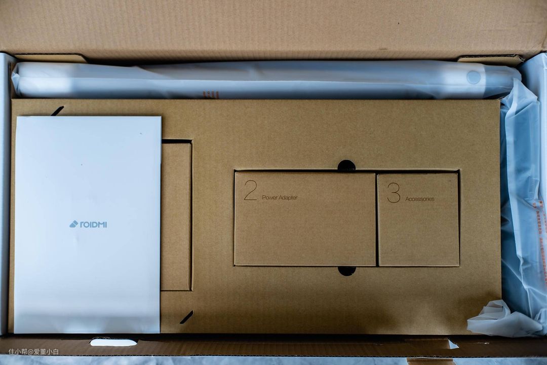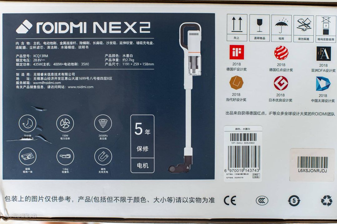 ▲▲另一面展示了展示了产品的参数及特色。型号XCQ13RM,颜色水墨白,净重约2.7kg,主机功率400W+电动地刷功率35W,70分钟的续航,150W的吸入功率、26500Pa的真空度、磁吸扫拖一体、1.6kg轻量机及磁吸无线充电,并且电机支持5年保修。从参数上来看不愧是次时代的旗舰机,所有参数都是可圈可点。而且设计上来自获得德国红点、iF等众多设计大奖的ROIDMI团队,在设计上并没有模仿戴森品牌,走自己的路线可谓难能可贵。