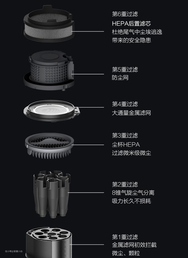 ▲▲吸尘器吸进的粉尘杂物并不是全部吸到尘杯里(只进不出那是黑洞)而是通过内置电机将粉尘杂物从吸嘴吸入,通过过滤系统将粉尘截留,尾气从排风口排出。所以过滤系统的过滤能力是十分重要的,否则会造成二次污染,反而把粉尘都给吹到空气中。睿米NEX2采用双滤芯6重空气过滤系统,前后两个HEPA滤芯,这点还真是挺给力的。