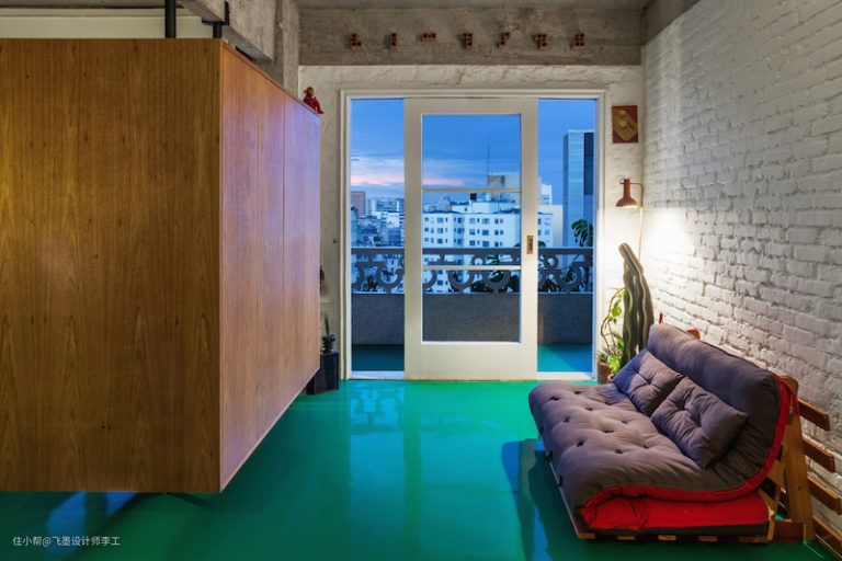 因为面积小,所以主要功能区全在一个空间里,上下留空的设计,能够改善功能区之间的采光和通风,整个空间看起来也更加通透。