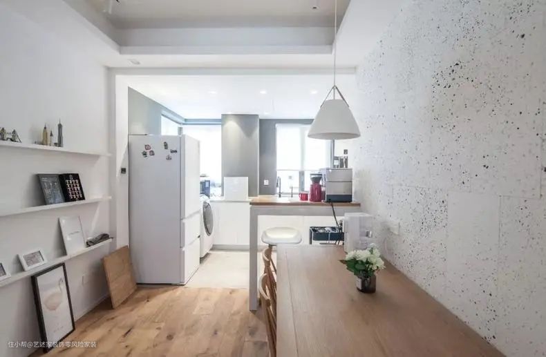 厨房门口做了小吧台,可以放些杂物。餐桌靠墙设计,原木风餐桌餐椅,比较简单清爽。