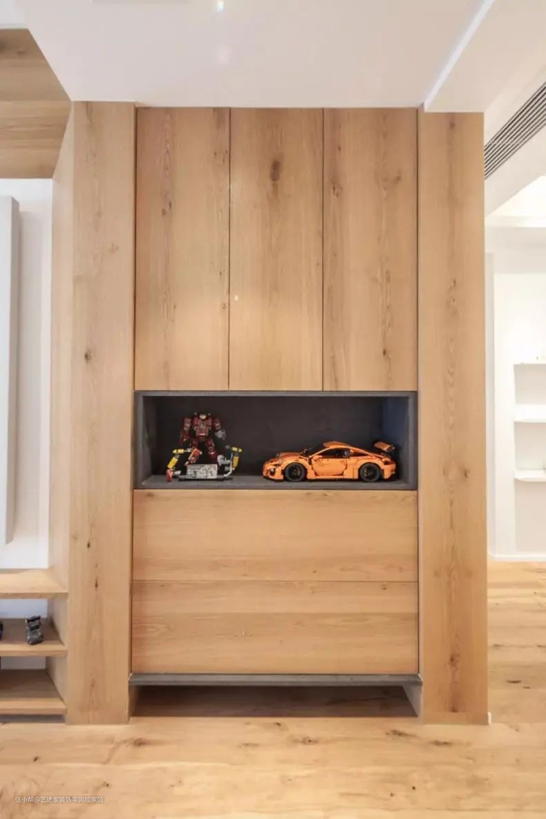靠墙设计了原木风收纳柜,增加储物空间,整个橱柜与电视墙相连,一体化设计,显得整体更加大气,原木与白色的搭配,也让整个玄关清爽干净。