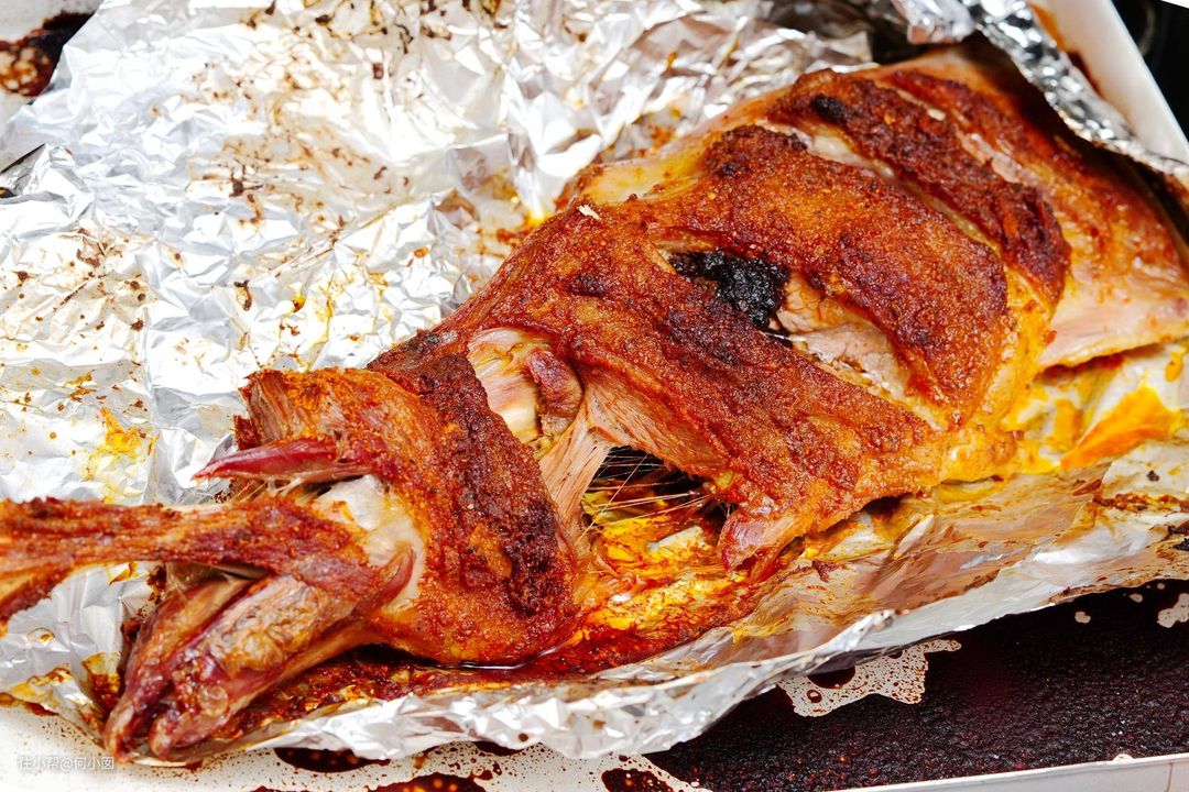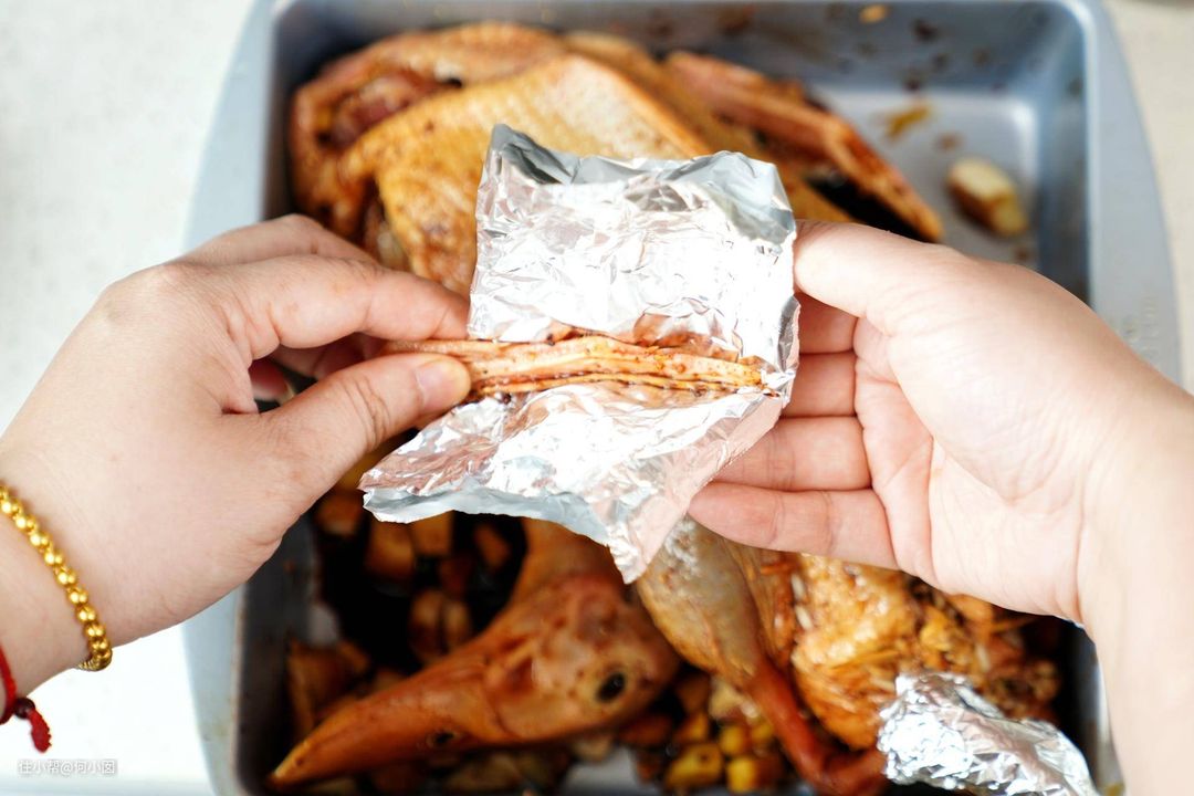 预热完成之后,把鸭子鸭翅尖和鸭掌用锡纸包裹好