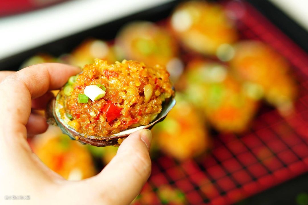 做法:首先把鲍鱼杀好打理干净,不会杀的请摊主代操作一下,自己杀也很简单,徒手或者用勺子都可以,然后开上花刀,摆在鲍鱼壳上,鲍鱼壳放烤盘中