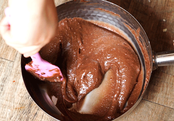 然后离火,迅速加入过筛的可可粉和低粉,混合翻拌均匀