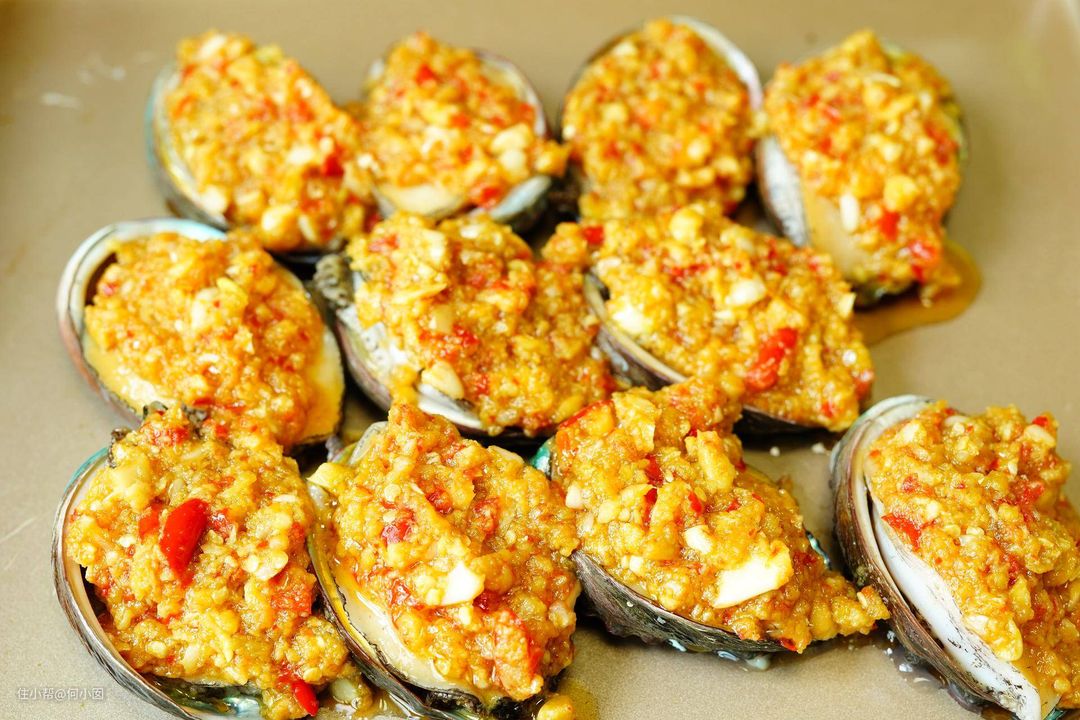 烤箱200度预热,把刚刚准备好的蒜蓉辣椒酱用勺子舀了放在鲍鱼表面