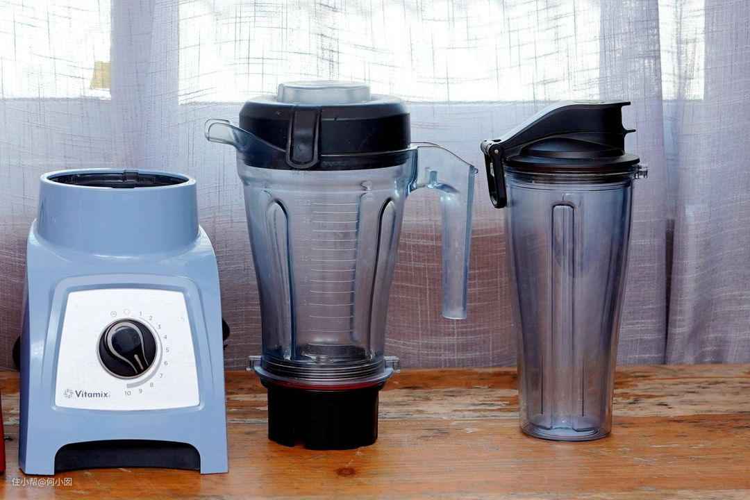 恐怕这是两台机器最大的差异之一了,小B采用全品牌通用的五方杯,Tritan材质,杯体透明,上下基本一样大小,杯体和杯盖都可以直接放洗碗机,容量是2600ml,小V采用的双杯,大杯标称容量是1200ml,小杯600ml,小V杯体颜色偏灰色,带导流口,杯体上大下小,杯体和底座可以拆开,不可整体直接放洗碗机