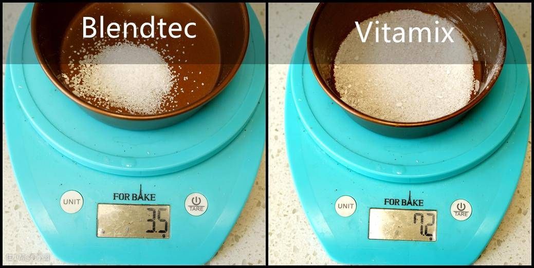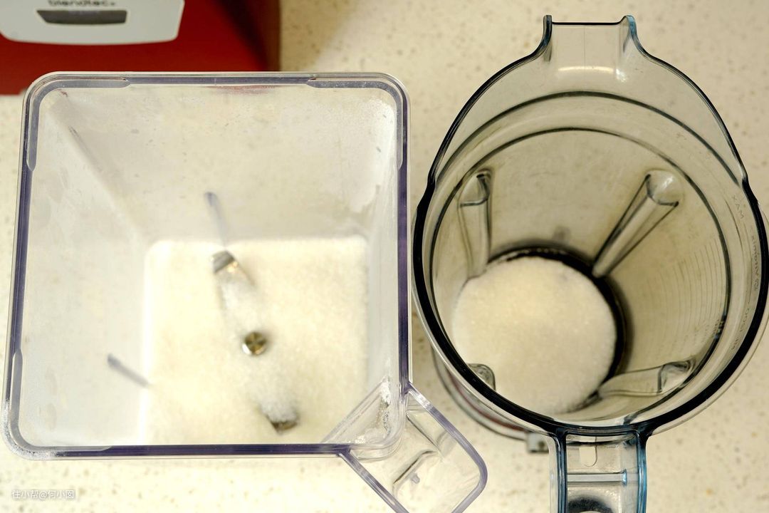 这个功能是破壁机经常都会用到的,特别是烘焙爱好者,有时糖粉或者细砂糖突然用完了,就会需要磨一些来用,我基本上是自己一次性多磨一些,用保鲜盒装了,用完了再磨,比较少买市售糖粉,这里一个小知识点,一般来说,破壁机的最小研磨量是食材放入需要至少与刀片平齐或者略高于刀片的,否则会发生空转,无法研磨的现象,实测,100g白砂糖,小B是无法研磨的,小V可以