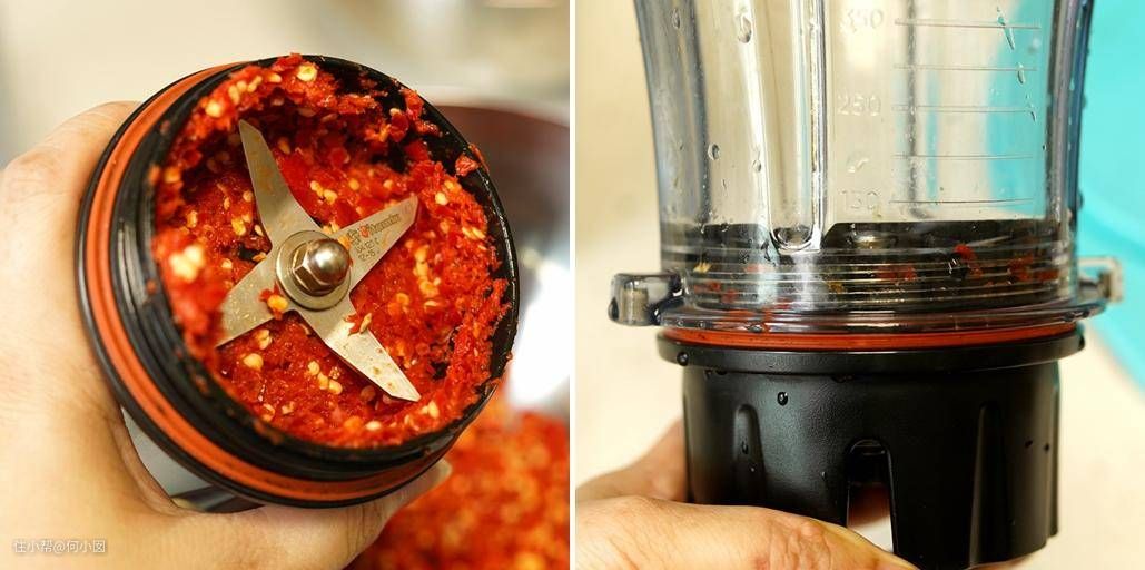 小结:就切碎红辣椒或者类似的大颗粒食材,比如姜蒜,甚至不加水的果汁含量低的水果,凤梨、苹果、梨也是如此,小V能切碎的量大概只有小B的四分之一到五分之一左右,对于大颗粒的食材,小V基本上都会下层研磨好,但是上层食材没办法,必须把食材克重降低在100g以下才有可能,比如小B可以一次性切400g的红辣椒,10s就能完成,而小V一次最多只能切80g左右,效率太低,其他同类型的食材同理,对于家庭使用来说,小B略胜一筹,毕竟100g以下这样极少量的食材切碎还是很少遇到的,而100g以上的食材切碎却是很经常会用到的