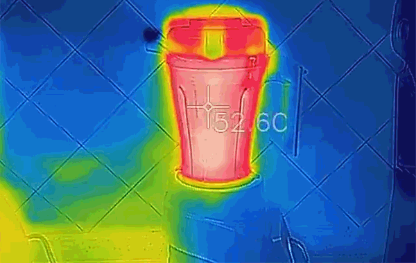 使用高速档位搅拌清水5分钟后的对比,小B杯体温度达到最高73度,物理加热确实给力,电机温度控制在最高44度,对于3.0马力的电机来说,这个温度控制已经相当厉害了