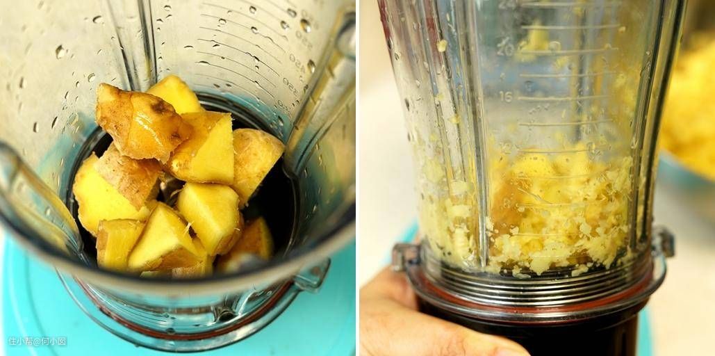 也是经常会用到的功能,多炒几个菜,或者熬姜汤,烘焙里面做姜汁撞奶,都会用到,手切太慢了,用破壁机,低速10秒钟吧,就搞定了,非常方便,首先因为两个杯子大小差很多,姜切同样的大颗粒,其实不切这么小也可以的,只是因为小V底太小,如果姜太大会大部分空转,所以我切成了颗粒,如果是小B就没这样的担忧,姜切这个两倍大就可以完成了,因为杯子大小的差异,我同比例的,小B使用了300g左右的颗粒姜,小V使用了100g左右