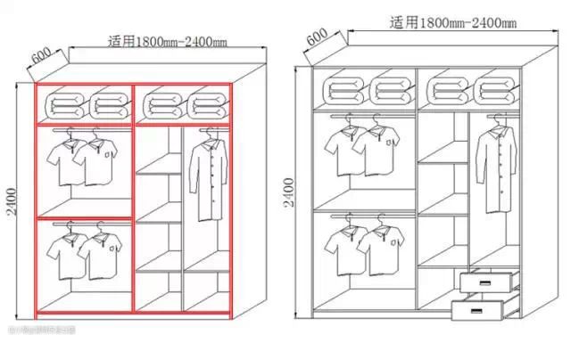 至于叠放衣物的柜体,以衣物折叠后的宽度来看,柜体设计时宽度在330mm~400mm之间、高度不低于350mm;