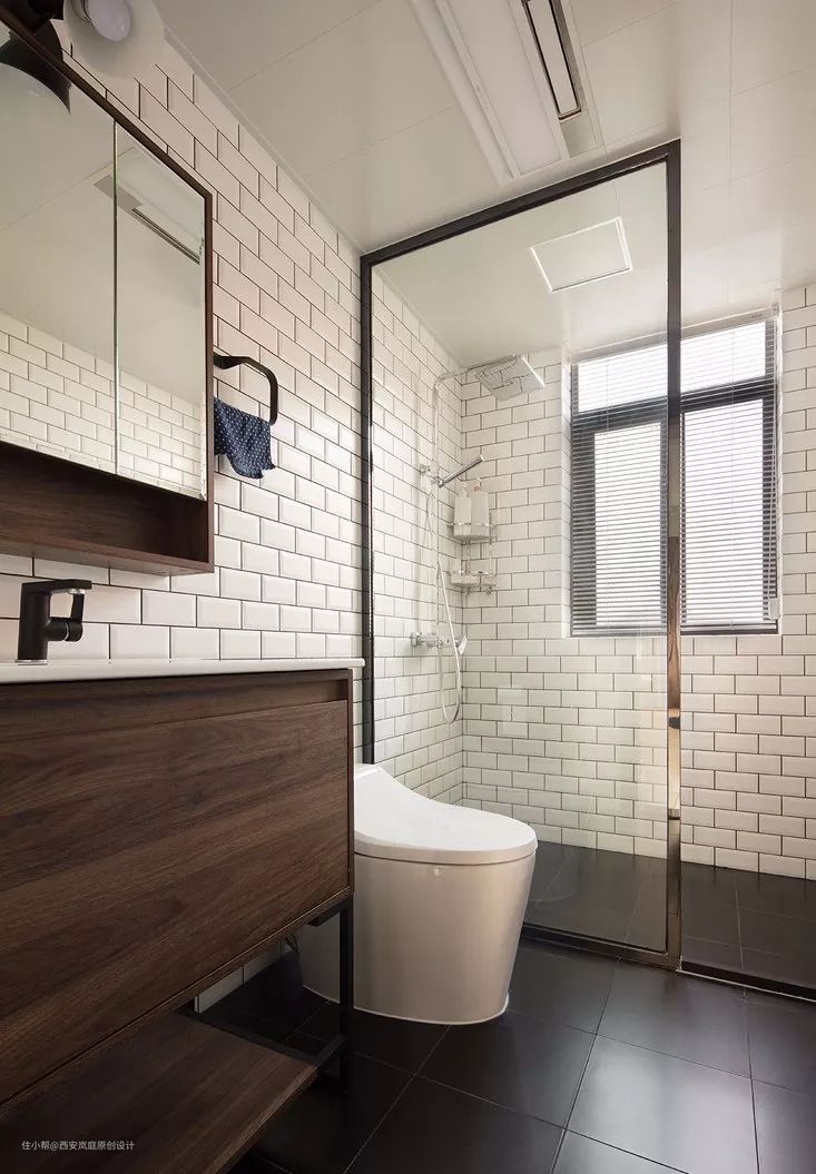 这是最常见的卫生间形态,占地面积小,却也可以做出简单的干湿分区,能够比较有效地阻止水蒸气灾害。