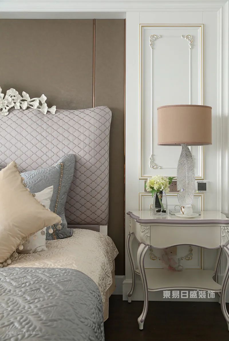 法式双人床与白色木饰雕花背景墙相互映衬主人不凡的品味在空间中娓娓道来此刻放松心情一起去寻觅幸福的踪迹