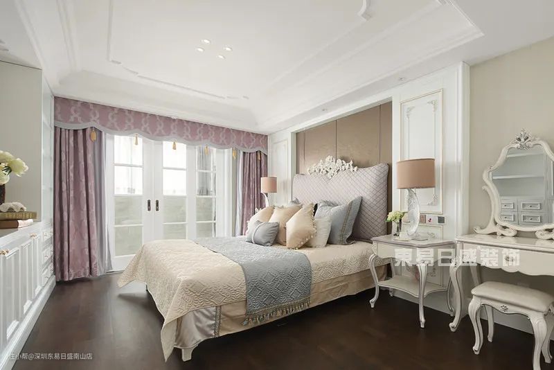 一推开门映入眼帘的是一个白色的寝殿典型的法式中轴对称布置优雅平和的色调营造完美舒适的卧房空间