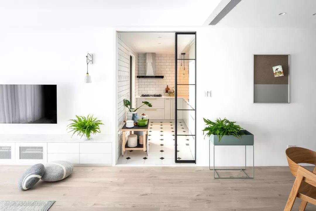 宽大门洞+黑框玻璃推拉门是这两年的网红款,常用在厨房和餐厅之间,打造一个半开放式厨房。门洞高还能让室内空间更显开阔,无形拉高层高。